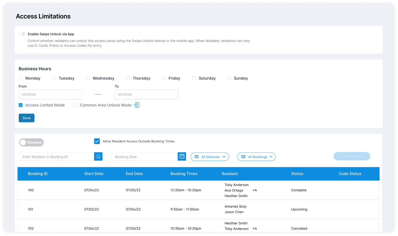 Define access hours for amenities and common areas, or activate Passage Mode to disable auto-lock during specific times.
